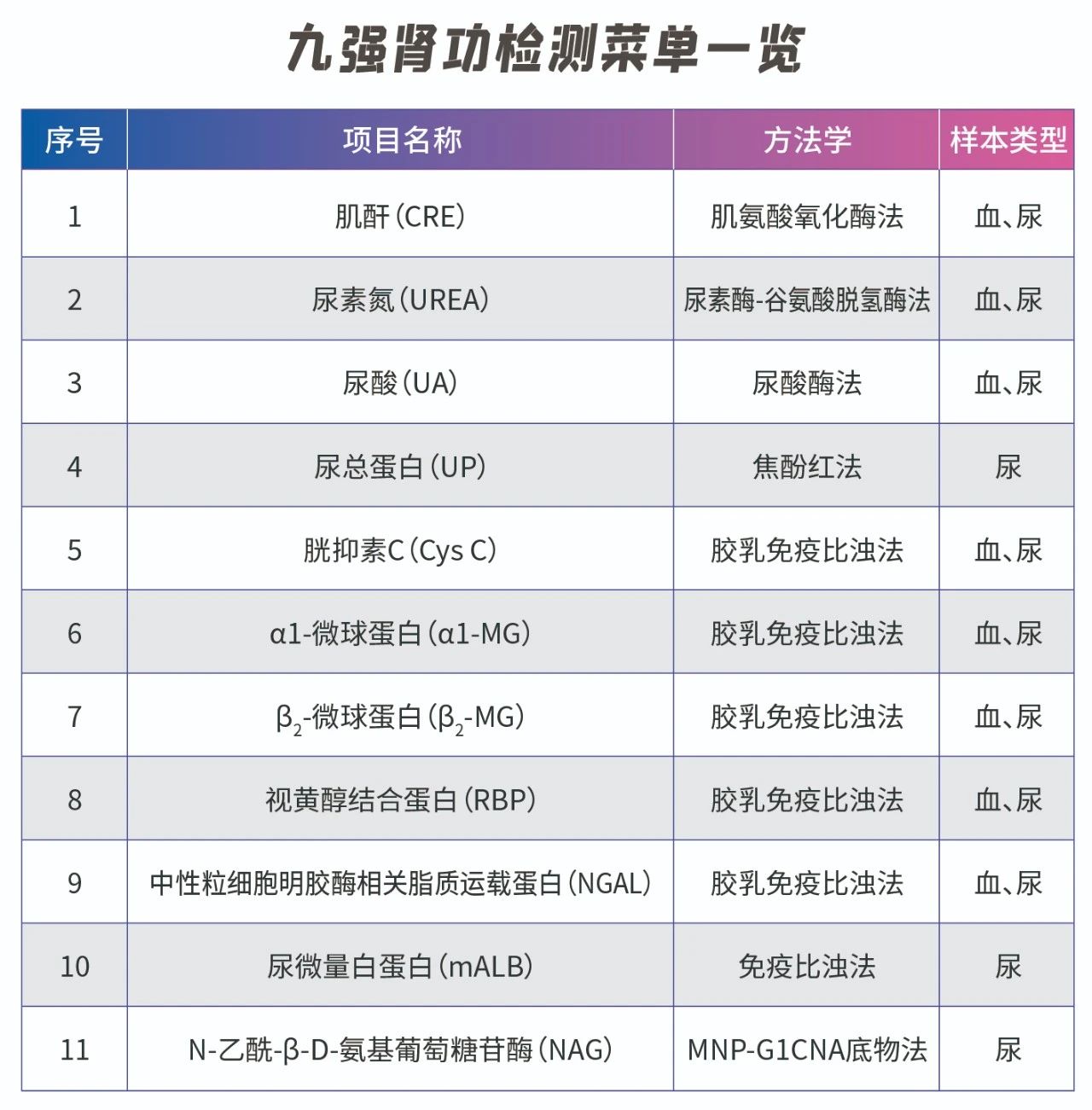 通例项目由于对早期肾损伤敏感性缺乏,,,,,,,在反应肾脏功效上常保存一定的滞后性,,,,,,,因此需要一些迅速的检测指标,,,,,,,资助我们在早期发明肾脏异常,,,,,,,以便及早最先治疗。。。。。。胱抑素C(Cys C)、视黄醇团结卵白(RBP)、α1微量球卵白(α1-MG)及中性粒细胞明胶酶相关脂质运载卵白(NGAL)这些指标在反应早期肾脏功效损伤上有显着优势。。。。。。